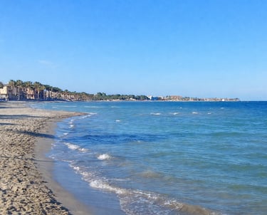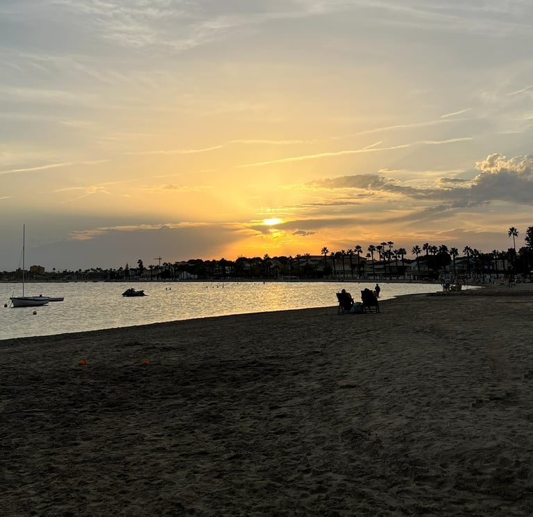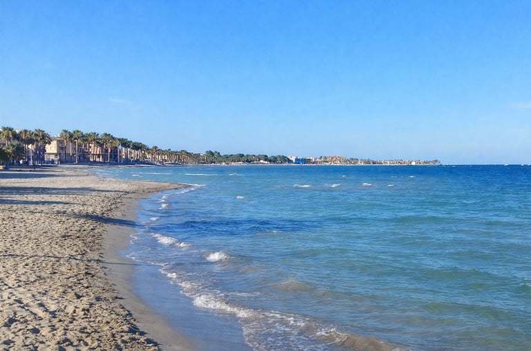 The beaches of the Mar Menor are characterised by shallow, warm and calm waters, with sandy bottoms and gentle slopes. These beaches are especially popular with families, older visitors and water sports enthusiasts. Town beaches such as Los Alcázares, Santiago de la Ribera and Lo Pagán offer long promenades, full services and easy access. Several beaches in this area, including Playa de Los Narejos and Playa de Villananitos, regularly fly the Blue Flag.