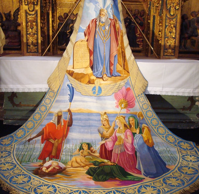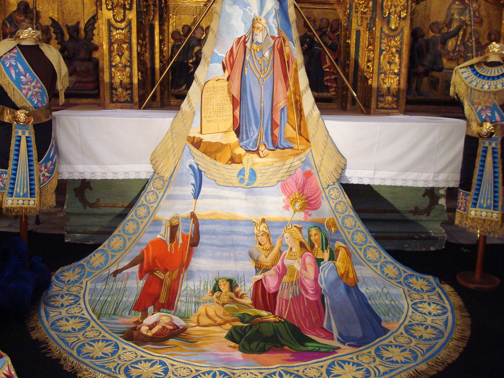 Embroidered cloak from Lorca depicting the scene of Moses being rescued as a baby from the waters of the Nile. Museo Azul, Lorca. Photo by Awuachumele.