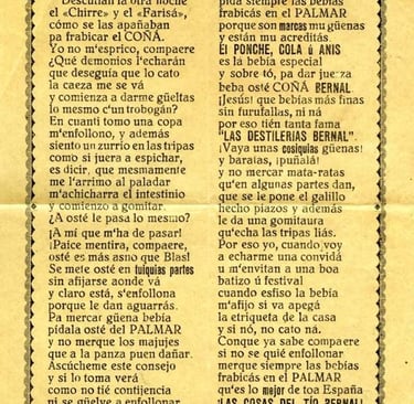 A pamphlet from around 1950 advertising "Destilerías Bernal" written in Panocho, the traditional language of the Murcia region, now obsolete. General Archive of the Region of Murcia.