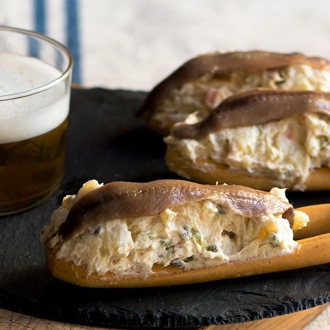 The "marinera" is a tapa consisting of Russian salad on a crispy, salted doughnut, topped with an anchovy. It's the most popular tapa in the Region of Murcia.