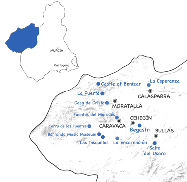 The Northwest Region of Murcia is one of the most beautiful, unspoiled, and surprising areas in southeastern Spain. Formed by the municipalities of Bullas, Calasparra, Cehegín, Moratalla and Caravaca de la Cruz, this inland comarca offers a radically different face of Murcia: greener, cooler, more mountainous, and deeply connected to nature, tradition, and history.
